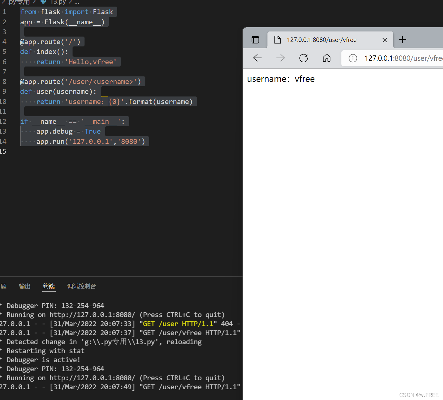 - 只需要在app.run原基础上加上debug.True,或者直接app.debug=True